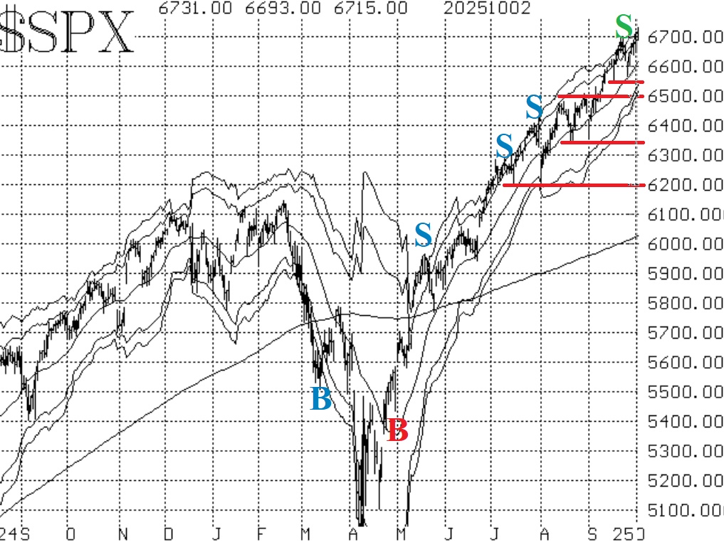 $SPX has support at the various areas denoted by red horizontal lines on the chart in figure 1: 6550, 6500, 6346-6360, and 6200. In reality, I would think that a drop below 6500 would generate some additional selling, for that is the area that was finally overcome in early September after having toyed with that level as resistance for much of August.