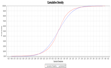 Using the empirical PDF a CDF can be constructed. The following chart shows the CDF derived from the PDF above. The red line depicts the empirical CDF and the blue line shows the log normal CDF for comparison. One difference between the two that is immediately apparent is that the log normal CDF is smooth and continuous whereas the empirical curve neither smooth nor continuous. The $SPX PDF used to construct the CDF is missing some bars in some of the upper end buckets. Even if all the buckets contained data the empirical CDF would still not be continuous. Recall that to calculate the expected profit a very small increment of standard deviations was used. Since the log normal CDF is a continuous function a value for any number of standard deviations can be computed. This is not the case for the empirical CDF. For values that are not points on the empirical CDF curve an interpolation method will need to be used to determine the probabilities.