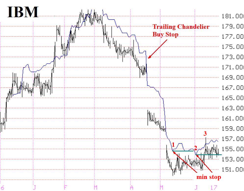 Some technicians feel that if one is using a Chandelier Sell Stop, it should never be reduced in price (or a Chandelier Buy Stop should never be raised). I mostly agree with this line of thinking. As an example, consider the chart of IBM on the right. This is during the period that we owned puts via the put-call ratio sell signal. The Chandelier Buy stop is the blue line that hovers above the price chart on the way down. Eventually, when IBM slowed its descent, the blue line rose, but most technicians would consider the stop to be what I have labeled as “min stop” – the minimum price that the Chandelier buy stop had reached. The first one (labeled as “1") occurred in early May. Later, at point “2.” the Chandelier buy stop moved to lower levels, and the “min stop” was adjusted lower. Eventually, at point “3,” IBM finally closed above the “min stop” and the short sale or long put position was stopped out. Note that if one had not used the “min stop,” the short would still not have been stopped out because IBM has still not closed above the Chandelier Buy Stop as of June 22nd – the last date on the chart.