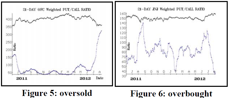 Figure 5 is the current chart of Feeder Cattle. The putcall ratio is racing higher as put buyers run amok, but the ratio hasn’t rolled over yet; that is “oversold.” Figure 6 is the chart of JNJ a few days ago. The JNJ put-call ratio was plunging to extreme lows as call buyers dominated the scene, but the ratio hadn’t rolled over as of the date on this chart; hence it was “overbought.”