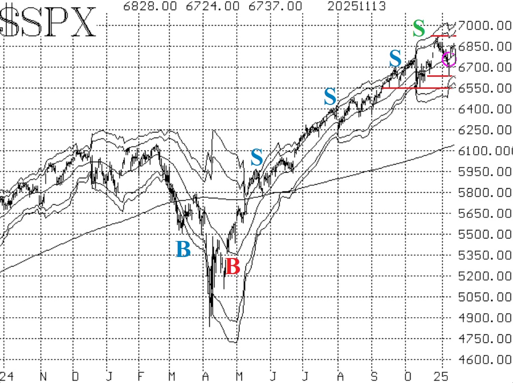 The equity-only put-call ratios are still negative for stocks. That is, the ratios are rising. The standard ratio has made new relative highs on several days this week. The weighted ratio formed a tiny peak a couple of days ago, but that is not significant according to the computer programs that we use to analyze these charts.