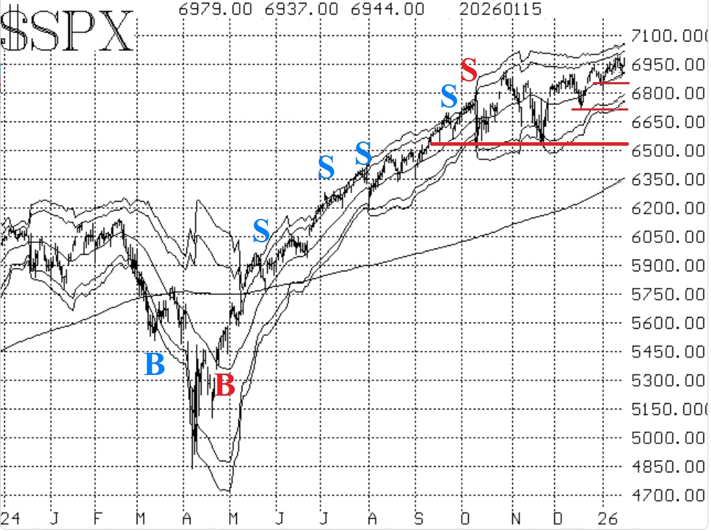 $SPX made another new all-time high on both January 9th and 12th -- the first time it's made new all-time highs on back-to-back days since last October. That would indicate a target of as high as 7300. A less aggressive target would the +4 sigma modified Bollinger Band at about 7050. There is now support at 6900, 6840, and 6720 (the recent lows of each pullback in the last few weeks). A move below 6720 would be very negative, though, because that is the December low. Meanwhile, there is small resistance at 6986 (the highs so far).